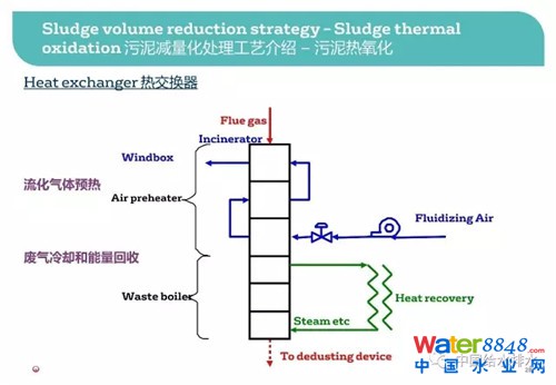 污泥焚燒后煙氣進入的下一設(shè)備是煙氣換熱器。換熱器實現(xiàn)兩個功能:第一個功能是給流化空氣預(yù)熱;另一個功能是回收煙氣中的熱量,提高系統(tǒng)的熱效率。若焚燒之前有干化工藝存在,那么這部分回收的熱量可以轉(zhuǎn)換成飽和蒸汽,供給干化機使用。