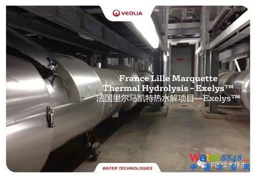 這是我公司在法國里爾馬凱特污水處理廠采用的連續(xù)式熱水解的現(xiàn)場照片。這個項目的日處理能力是60噸干泥。熱水解采用12米長的管式反應(yīng)器,外殼包有保溫層。這座污水處理廠環(huán)河而建,威立雅為其進行了水廠處理工藝的升級改造,采用了緊湊型工藝,增設(shè)了三級處理工藝。泥區(qū)主要采用熱水解+消化+干化的處理工藝。