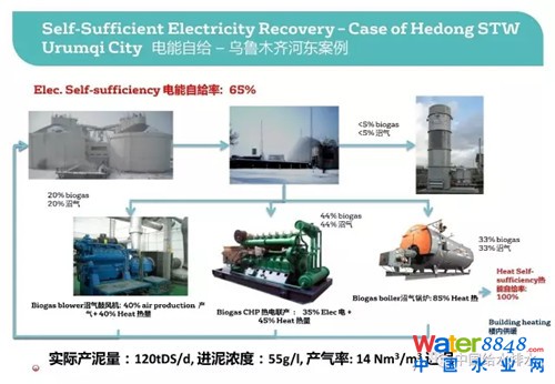 這座污水處理廠每天共產(chǎn)生約120噸干泥。實際沼氣產(chǎn)量為32400Nm3/d(該廠現(xiàn)階段未滿負荷運行)。產(chǎn)生的沼氣約有 40%進行熱電聯(lián)產(chǎn),20%拖動沼氣鼓風機,30%用于沼氣鍋爐。最終,該廠實現(xiàn)了熱能的100%回用,電能自給率65%。
