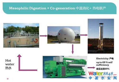 這是威立雅在南布達佩斯污水廠的聯(lián)合厭氧消化的業(yè)績。增加聯(lián)合厭氧消化之后,沼氣產(chǎn)量提高了4倍,熱電聯(lián)產(chǎn)產(chǎn)電提高的3倍,能源自給率達到80%。