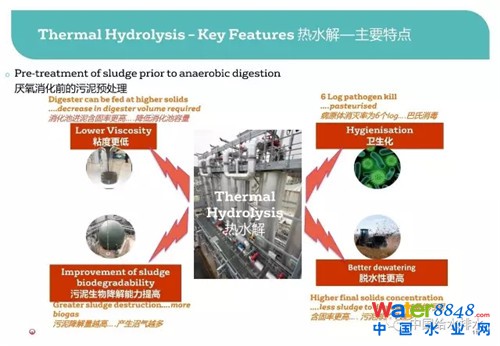 第二種基于消化應(yīng)運而生的污泥處理技術(shù)是污泥熱水解技術(shù)。它一般是作為消化的一種預(yù)處理工藝出現(xiàn)的。熱水解就是利用高溫高壓蒸汽,實現(xiàn)對污泥蒸和煮的過程。在這個過程中,污泥細胞破壁,胞內(nèi)物質(zhì)溶出,成為了可以利用的一部分基質(zhì)。這樣一來,沼氣產(chǎn)量得到了提高;污泥粘度降低,使得消化池可以接收含固率更高的污泥;對污泥進行高溫蒸煮也是一個細菌滅活的過程,因此污泥的衛(wèi)生學指標也將得到改善;最后,消化后脫水工藝可以實現(xiàn)更高的污泥含固率;減少后續(xù)處理或處置的設(shè)備或污泥體積。