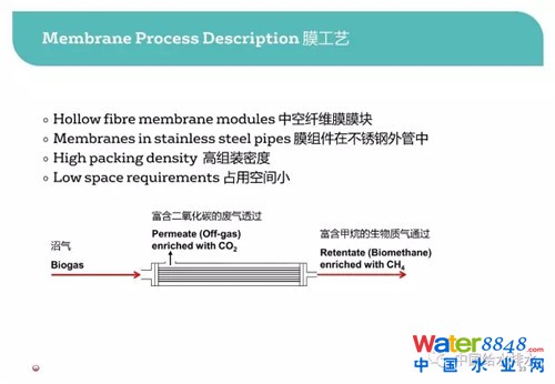 跟消化相關(guān)的技術(shù),都會有沼氣產(chǎn)生。因此,威立雅也開發(fā)了基于膜工藝的沼氣提純技術(shù)。采用中空纖維膜,利用二氧化碳和甲烷在膜中不同的透過速度,實現(xiàn)甲烷的分離和提純。