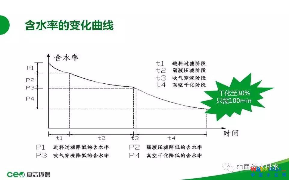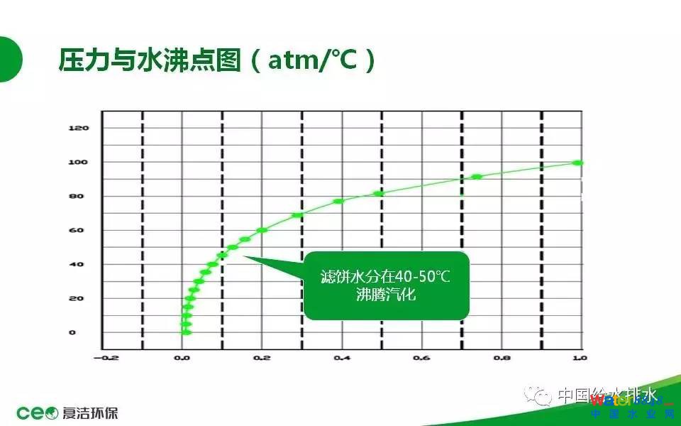 低溫真空脫水干化成套技術(shù)主要是針對(duì)含固率比較高的或者含水率比較低的物料的固液分離,實(shí)現(xiàn)脫水干化一體化,減少了污泥在脫水和干化這兩個(gè)工藝之間的一些轉(zhuǎn)換,包括一個(gè)時(shí)間的轉(zhuǎn)換,包括空間的轉(zhuǎn)換,在這個(gè)轉(zhuǎn)換過程中,也會(huì)降低對(duì)環(huán)保上,包括安全上的一些壓力。采用機(jī)械脫水以后,機(jī)械脫水有一個(gè)極限,脫到含水率80、70、60,機(jī)械脫水無法再降低,我們?cè)儆玫蜏卣婵崭苫脑,使污泥達(dá)到傳統(tǒng)熱力干化的脫水效果。可以實(shí)現(xiàn)污泥處理含水率10-60%可調(diào)。這是一個(gè)壓力和水沸點(diǎn)的曲線。右側(cè)是一個(gè)標(biāo)準(zhǔn)大氣壓下水的沸點(diǎn)是一百度,我們的低溫真空的概念,通過抽真空使泥餅中的水分在40-50度時(shí)沸騰汽化。這是整個(gè)工藝流程的四個(gè)階段:進(jìn)料過濾,隔膜壓濾,吹氣穿流,真空干化。