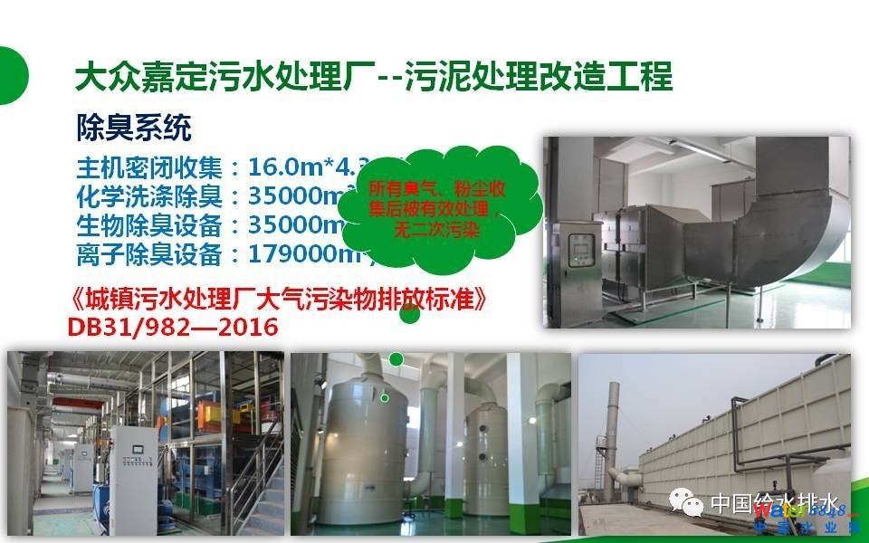 燃?xì)鉄崴仩t,加熱介質(zhì)90度熱水。真空脫濕系統(tǒng),配置真空泵、冷凝器、冷卻水。這個(gè)是設(shè)計(jì)院總體考慮,用園區(qū)再生水作為冷卻水。這是一個(gè)雙軸螺旋輸送機(jī),干化后污泥含水率小于30%。除臭設(shè)備簡(jiǎn)單說兩句,因?yàn)樵谏虾J?span lang="EN-US">20163月份出臺(tái)了一個(gè)地標(biāo)要求,地標(biāo)要求比惡臭污染物的控制要高的多,所以配置了化學(xué)除臭,加生物除臭,這是一個(gè)收集加排放,同時(shí)又配置離子送風(fēng)設(shè)備。所有的除氣和粉塵收集,經(jīng)處理達(dá)標(biāo)后排放。