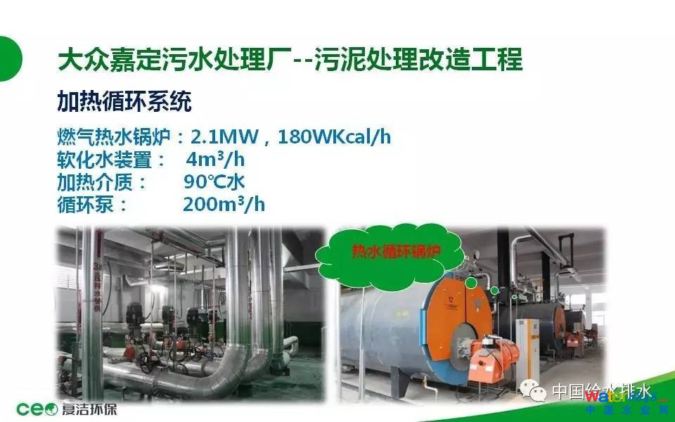 這個(gè)流程圖是典型的工藝流程圖。左側(cè)是污泥板塊,那么左上節(jié)是一個(gè)污泥濃縮設(shè)備,F(xiàn)在污水處理廠大多數(shù)都有重力氣濃縮,沒有重力濃縮的話,加一個(gè)設(shè)備,達(dá)到污泥預(yù)濃縮。右側(cè)我們?cè)趥鹘y(tǒng)的工藝上增加了一個(gè)熱源系統(tǒng),工藝圖中寫的是蒸汽,在項(xiàng)目過程中,所需要的熱源是80-90度的熱水,如果項(xiàng)目中有蒸汽,由蒸汽加熱熱水;如果沒有蒸汽,我們是配一些比如說電鍋爐、天然氣鍋爐,包括利用余熱蒸汽,兩三公斤低品位蒸汽,在這個(gè)過程中也可以使用。