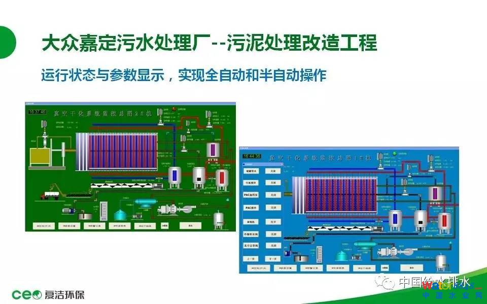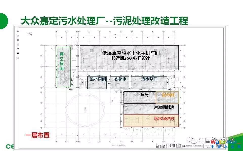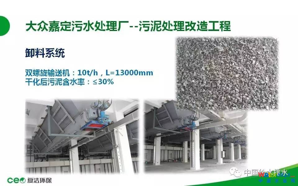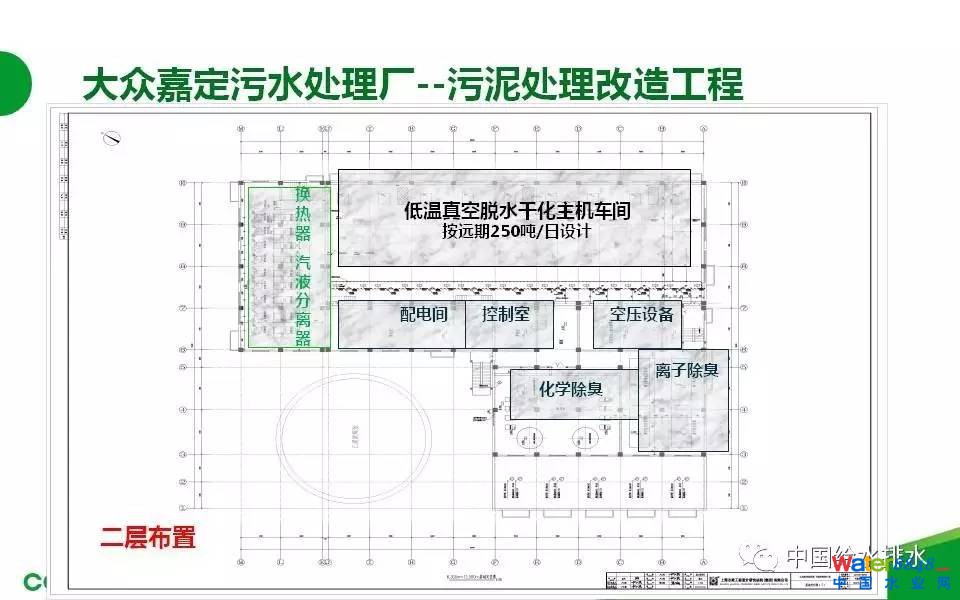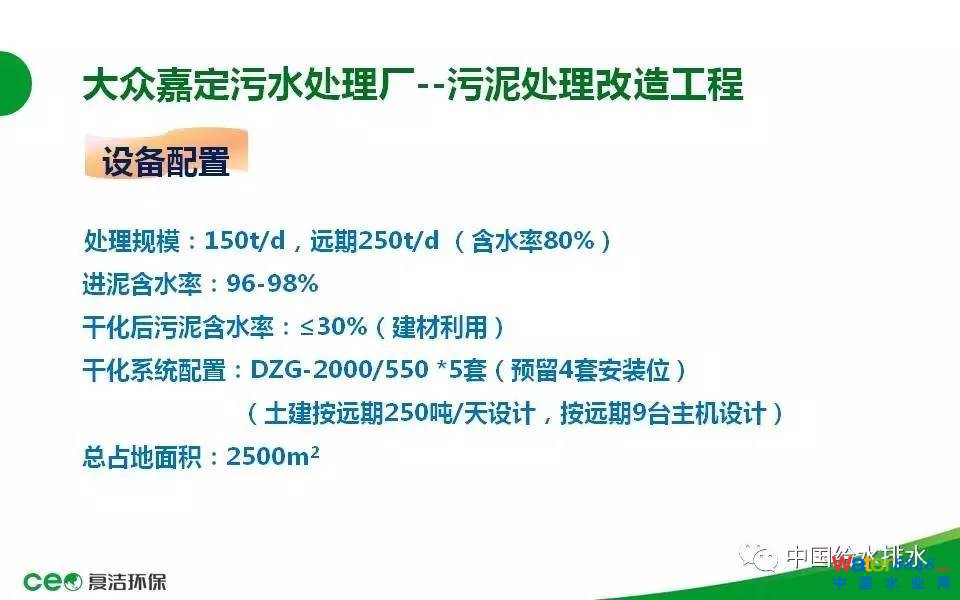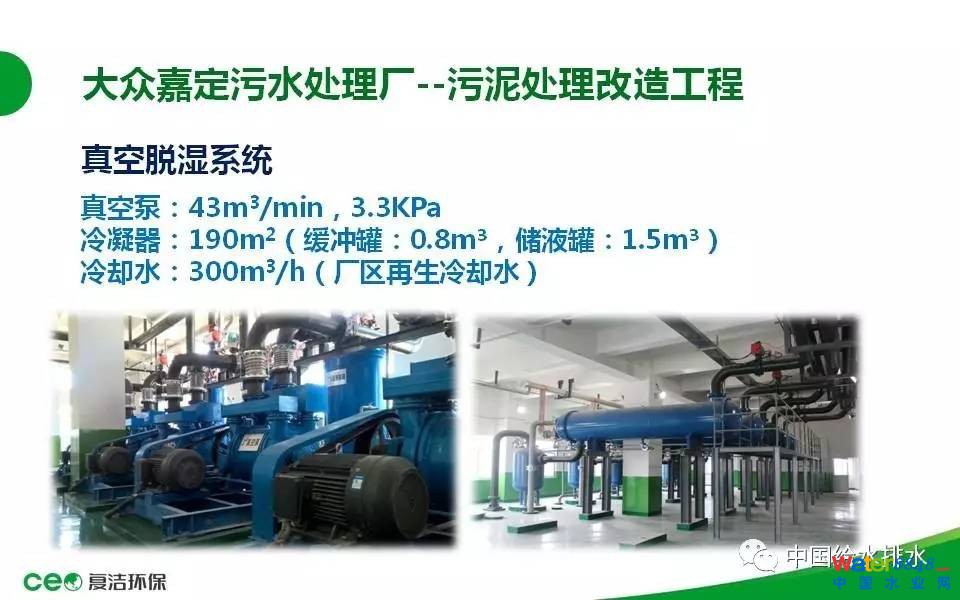 下面我介紹一個(gè)近期的工程案例。大眾嘉定污水處理廠:這是上海大眾嘉定BOT運(yùn)行的污水處理廠,污水廠的設(shè)計(jì)污水處理規(guī)模是17.5萬噸,分三期建設(shè),現(xiàn)在三期已經(jīng)建設(shè)完成了。近期的污泥處理規(guī)模是150噸,就是17.5萬噸的水,150噸的泥,污泥干化設(shè)備的供貨安裝,這是一個(gè)標(biāo)段,采用低溫真空脫水干化工藝,原泥96-98%一次性脫水干化至含水率30%以下,處理以后的污泥總量理論計(jì)算是42.8噸,減量71%左右。