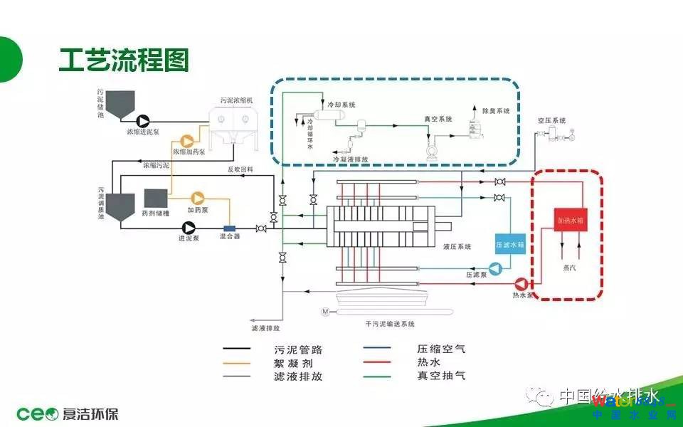 再增加一個(gè)系統(tǒng)就是真空系統(tǒng),污泥中的水分常壓下需要一百度以上才能沸騰汽化。熱源只有80度左右,所以提供一個(gè)低壓的環(huán)境,就是增加一個(gè)真空環(huán)境。這個(gè)技術(shù)集合脫水和干化一體化,從源頭進(jìn)行減量,避免污泥的大量外運(yùn),包括降低了一些外運(yùn)過程中的環(huán)境污染等等。那我們也是采用模塊化的設(shè)計(jì),根據(jù)項(xiàng)目建設(shè)的規(guī)模包括進(jìn)度,一次性設(shè)計(jì)、靈活分期建設(shè),后面有一些案例可以體現(xiàn)這一點(diǎn)。因?yàn)樗撍苫癁橐惑w,直接運(yùn)行成本更加低廉,;只添加少量常規(guī)的絮凝劑,藥劑成本低。熱源,我們采用熱水作為熱源,在項(xiàng)目建設(shè)階段,可以多途徑的去選擇熱源的組成,可以選擇低品位的余熱蒸汽,煙道氣,或者配置天然氣的鍋爐等等。