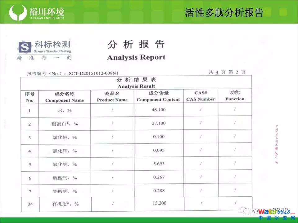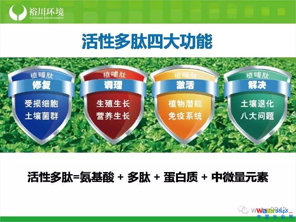 活性多肽產(chǎn)品,目前是裕川這種水解工藝能夠從微生物細(xì)胞里面提出來(lái),成分是氨基酸,加多肽、蛋白質(zhì)、中微量元素,可以鰲合的營(yíng)養(yǎng)元素,相當(dāng)于一次解決所有的土壤問(wèn)題。我們也做了分析報(bào)告,在活性多肽蛋白液里面的重金屬要比國(guó)家的食品類的重金屬、飼料級(jí)的重金屬,還要低2個(gè)數(shù)量級(jí)。同時(shí),我們的活性多肽通過(guò)了多氯聯(lián)苯和多環(huán)芳烴等的檢測(cè),沒有任何的有害物質(zhì),因?yàn)樗羌?xì)胞中的一種提取物。對(duì)活性多肽我們做了一次非常細(xì)致的分子量的檢測(cè),證明它富含18種氨基酸,而每種氨基酸都為植物提供非常好的營(yíng)養(yǎng)服務(wù),實(shí)現(xiàn)植物遺傳基因的正確表達(dá),最終才能夠?qū)崿F(xiàn)增產(chǎn)增收提質(zhì)。
