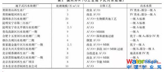 MBR工藝具有出水優(yōu)質(zhì)穩(wěn)定、剩余污泥產(chǎn)量少、占地面積小、脫氮除磷效率高、可實(shí)現(xiàn)全程自動(dòng)控制等優(yōu)點(diǎn),因而特別適用于占地面積有限、對(duì)自動(dòng)化要求程度高的地下式污水處理廠。該工藝集約化程度高、對(duì)周邊環(huán)境影響小、處理后的出水可直接用于景觀河道補(bǔ)水。除此之外,采用MBR 膜過(guò)濾工藝代替二沉池進(jìn)行深度處理,在節(jié)省占地的同時(shí)可提高生化池中的污泥濃度,從而提高系統(tǒng)的處理效率。目前,我國(guó)采用MBR技術(shù)的地下式污水處理廠如表1所示。
