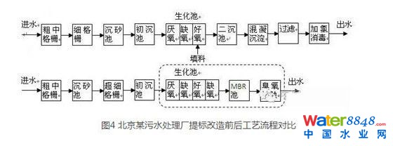 該污水廠處理規(guī)模為15萬m3/d,原工藝:Orbal氧化溝,出水標準一級B。改造工藝:BNR+MBR,出水標準一級A。提標改造前后工藝流程詳見圖7。