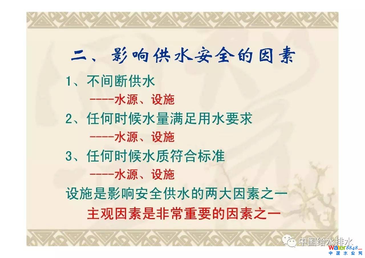 公共供水的基本任務(wù)是為用戶持續(xù)提供水量充足、水質(zhì)合格的用水,供水安全的基本目標(biāo)是圍繞公共供水三個基本任務(wù)要求,消除可能的安全隱患,保障公共供水系統(tǒng)實現(xiàn)持續(xù)提供、水量充足、水質(zhì)合格。分析了影響供水安全的因素即水源、水質(zhì)和設(shè)施,指出了設(shè)施穩(wěn)定運行與水力條件的關(guān)系,給出了水力優(yōu)化重點和對策。