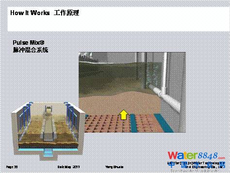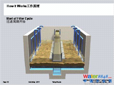 同時看一下濾池的結(jié)構(gòu),它實(shí)際上是一個非滿流的過濾,在承托層和清水層間有一層氣囊,在沙層上液位提升到一定的高度的時候,就會自動啟動脈沖攪拌,就是用清水壓著氣囊里面的氣自下而上的穿過承托層,穿過沙層,把沉積在沙層的污染物又反推到水層當(dāng)中,這樣把沙層上面的水層也作為一個納污層來利用從而保證正常過濾效果。