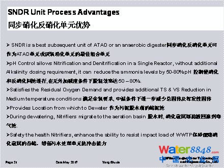 再回顧一下同步硝化反硝化單元的優(yōu)勢,這個優(yōu)勢比較多,這我只列舉其中兩點(diǎn),其中一點(diǎn)就是對高濃度的氨氮有一個很好的降解作用,通過這個單元能夠把氨去除50-80%。在適當(dāng)補(bǔ)充堿度情況下可以達(dá)到100%氮去除的效果。另一點(diǎn)就是有10%左右的減容效果。
