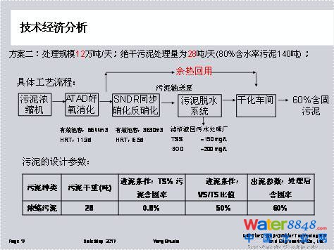 規(guī)模更大一些經(jīng)濟(jì)性更好一些。對于污泥規(guī)模為140/d80%含水率的污泥,它的處理的一個全流程,它的處理對象是針對剩余污泥,含固率只有0.8%的活性污泥,經(jīng)過全流程的處理,最后要達(dá)到60%含固率的泥,從泥量平衡上來說,我處理的對象是從3500噸,最后降到32噸,總體上達(dá)到99%以上的減容效果,它的一些經(jīng)濟(jì)參數(shù)是這樣的。運(yùn)行費(fèi)用是55元每噸80%含水率的污泥,這個全流程是從濃縮開始,一直到預(yù)熱回收利用之后達(dá)到60%含固率的泥,總的運(yùn)行費(fèi)用是150元每噸80%含水率的污泥。而設(shè)備的參數(shù)供大家參考一下,具體項(xiàng)目參數(shù)還需具體分析。