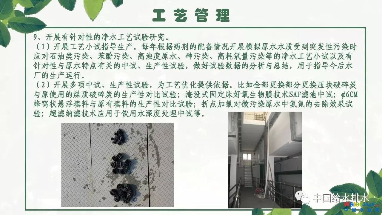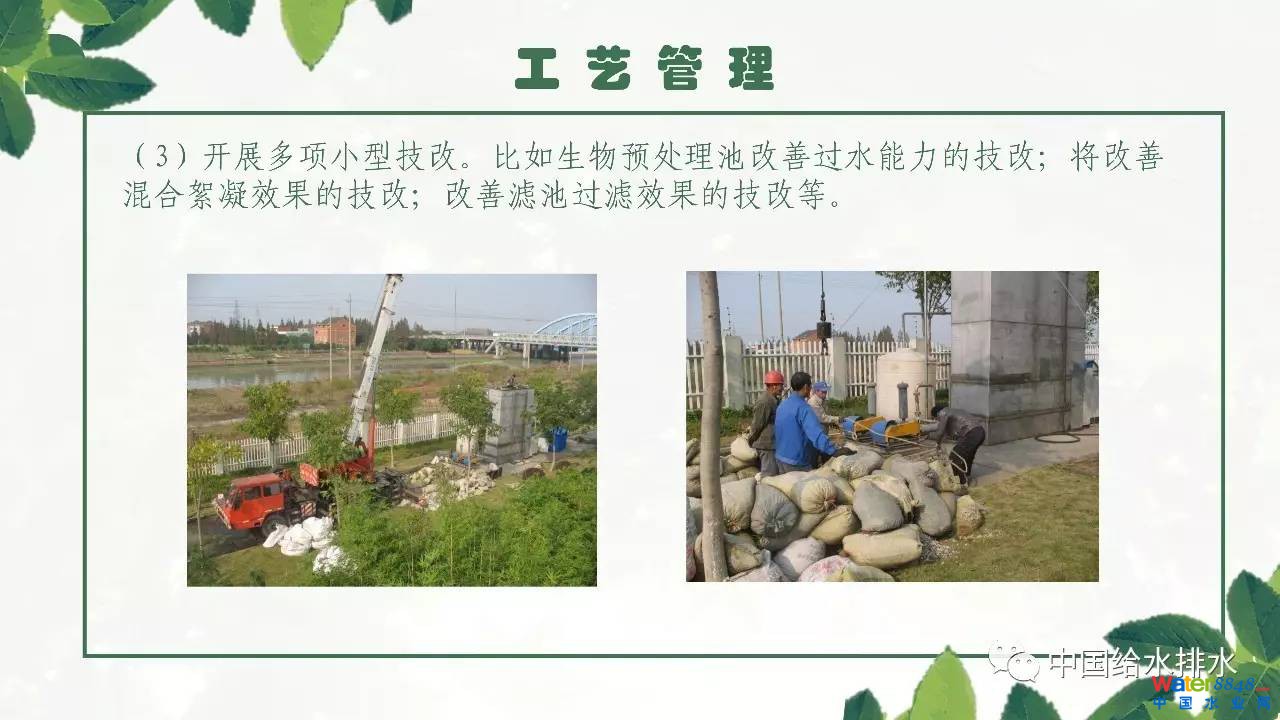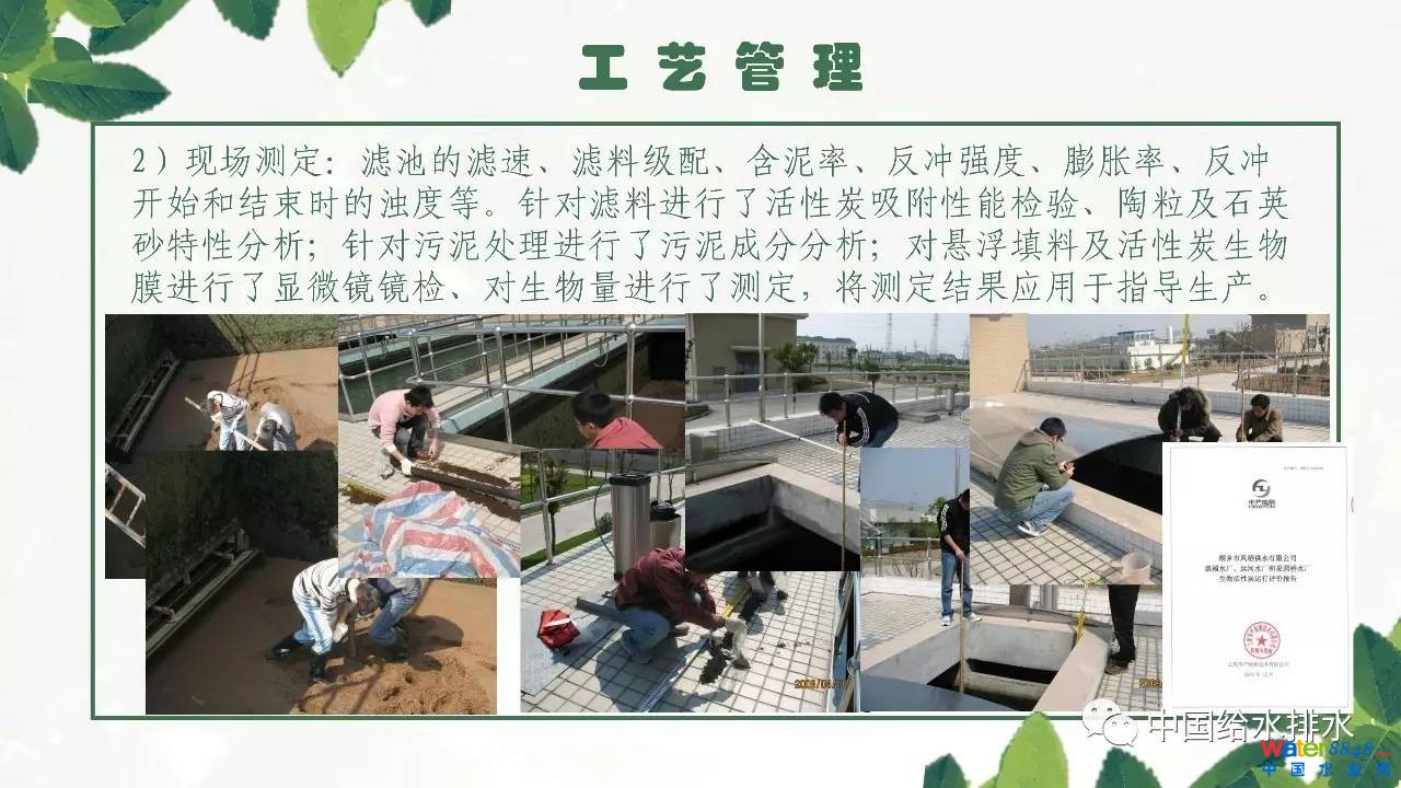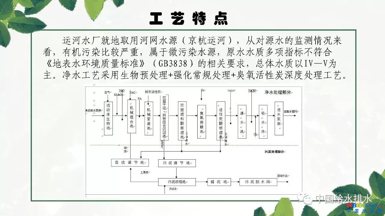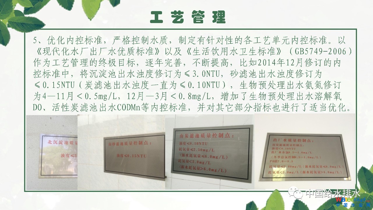 運河水廠就地取用河網水源(京杭運河),從對源水的監(jiān)測情況來看,有機污染比較嚴重,屬于微污染水源,原水水質多項指標不符合《地表水環(huán)境質量標準》(GB3838-2002)的相關要求,總體水質以IV~V為主。凈水工藝采用生物預處理+強化常規(guī)處理+臭氧活性炭深度處理工藝。報告詳細介紹了運河水廠在工藝管理方面的一些措施,例如不斷完善工藝管理手冊,工藝管理手冊內容涵蓋水廠概況、工藝管理、檢測方法、工藝原理、工藝調整、水質標準及規(guī)范等七個方面;選擇適合的藥劑品種開展小試;工藝設施按要求巡查及維護;工藝參數的技術測定與分析評估,掌握各單體生產運行的實際情況,通過測定數據分析運行狀況是否合理;優(yōu)化內控標準,嚴格控制水質,制定有針對性的各工藝單元內控標準等。
