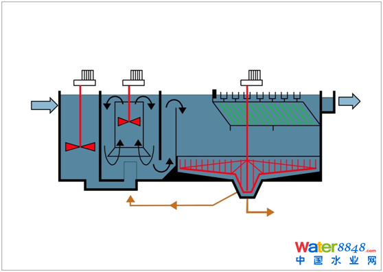 將投加的微砂負(fù)載在形成的礬花上,極快地加速后續(xù)的泥水分離,微砂通過旋流分離回收重復(fù)利用。適應(yīng)于占地特別有限的場(chǎng)合,上升流速40-60m/h;除磷;適應(yīng)現(xiàn)有水廠的提質(zhì)擴(kuò)