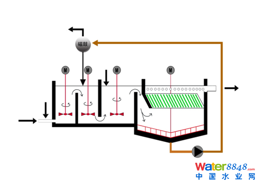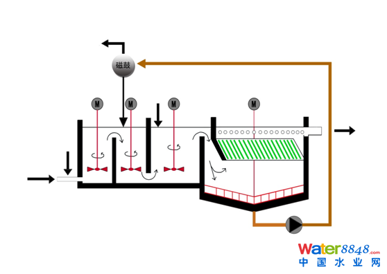 將投加的磁粉負(fù)載在形成的礬花上,極塊地加速后續(xù)的泥水分離,磁粉通過磁鼓回收重復(fù)利用。占地非常小,上升流速60-80m/h