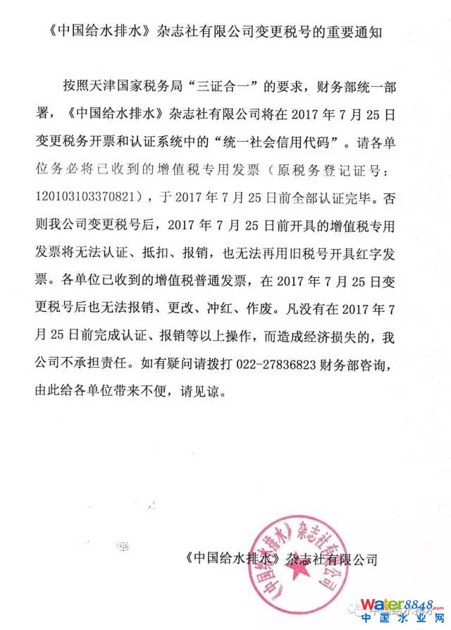 《中國給水排水》雜志社有限公司變更稅號的重要通知