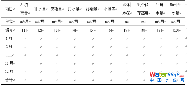 根據(jù)當?shù)貧庀筚Y料和用地規(guī)劃、徑流系數(shù)等可計算出該月內(nèi)匯流雨水量和蒸發(fā)量;補水量指較為固定的水源(如再生水)每月進入濕塘的水量,該值可能為0;回用水可用于綠化或噴灑道路等,依據(jù)各地用水定額而定;滲漏量為濕塘的滲漏損失,可依據(jù)實際條件計算,也可按水體總量的10 %進行估算。確定完以上水量后,可以填寫表3-2中[1]~[5]項的內(nèi)容。根據(jù)上述幾項數(shù)值,由水量平衡計算公式3-5可得水量差: