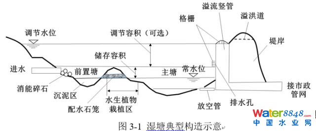 濕塘一般由進水口、前置塘、主塘、溢流出水口、護坡及駁岸、維護通道等構(gòu)成。