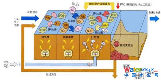 •厭氧、缺氧、好氧三種不同的環(huán)境條件和不同種類微生物菌群的有機(jī)配合,能同時(shí)具有去除有機(jī)物、脫氮除磷的功能。