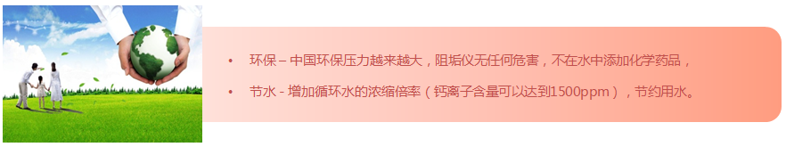 阻垢儀采用電磁方法除垢,它是由一臺調(diào)頻電流發(fā)生器和纏繞在管道外壁的信號電纜組成, 線圈產(chǎn)生感應磁場,影響流過的水,該設備可以處理各種復雜水質(zhì)的結(jié)垢問題 。
