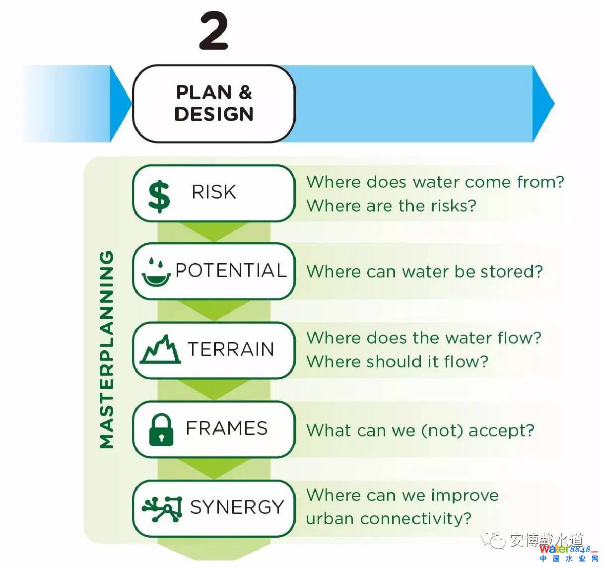 上圖總結(jié)了對形成總體規(guī)劃實際設(shè)計的綜合考慮。相關(guān)利益部門將仔細審查設(shè)計師和工程師調(diào)研和設(shè)計洪水流向、洪水存儲及輸送地帶的過程,從而對決策框架的制定或決策應(yīng)用給出限制或支持意見,并最終確定該規(guī)劃與其它城市環(huán)境規(guī)劃的結(jié)合點,如公園或自行車車道。相關(guān)利益部門可多次審查規(guī)劃設(shè)計,每當(dāng)有新的發(fā)現(xiàn)時須隨時更新并改善設(shè)計。
