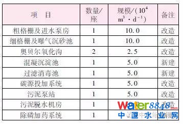 濟源市城市污水處理廠一期工程設(shè)計規(guī)模為5×104m3/d,采用奧貝爾氧化溝工藝,設(shè)計出水水質(zhì)執(zhí)行《城鎮(zhèn)污水處理廠污染物排放標(biāo)準(zhǔn)》(GB 18918—2002)一級B標(biāo)準(zhǔn),處理后尾水約3.5×104m3/d作為循環(huán)冷卻水回用于沁北電廠。根據(jù)要求,該污水廠出水標(biāo)準(zhǔn)需提高到一級A標(biāo)準(zhǔn)。