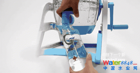 為了更方便的使用凝固劑來凈化水,他們還設(shè)計了一個大的凈水罐,它的中間有濾網(wǎng),臟東西與凝固劑的混合物都可被它吸入,你只要轉(zhuǎn)動搖把就好。