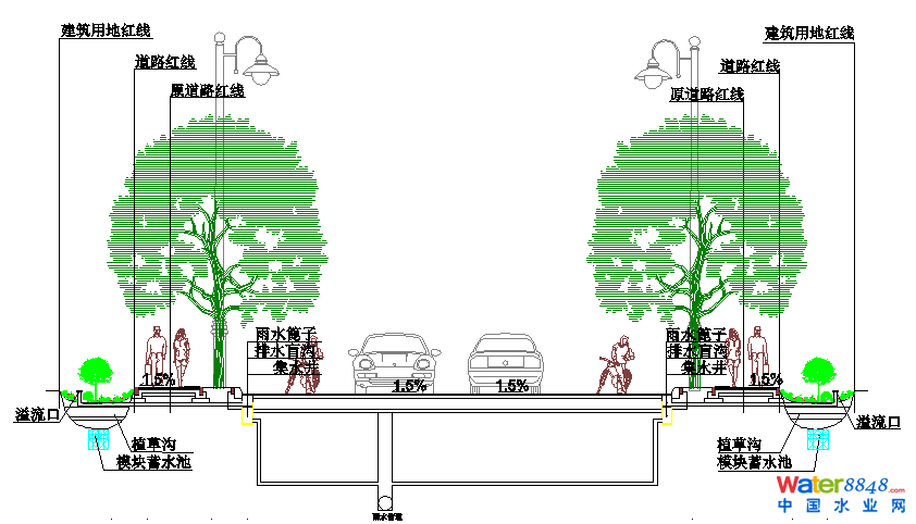 1.新建道路兩側(cè)綠地可采用生物滯留池(帶),凈化地表雨水徑流,滯蓄雨水,削減徑流峰值;現(xiàn)狀道路存在積水問(wèn)題或污染較重的,對(duì)原有綠化帶改造,可采用生物滯留池形式,控制徑流污染。