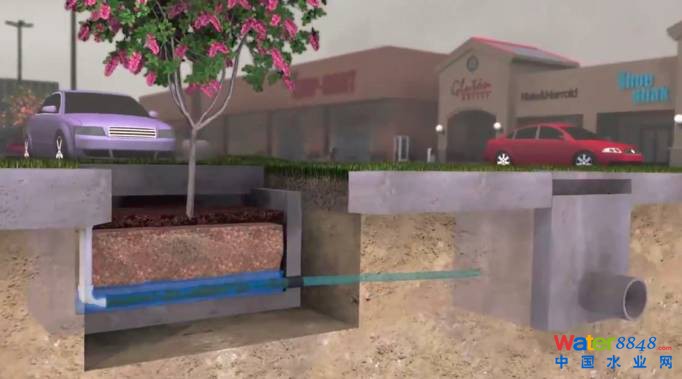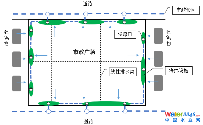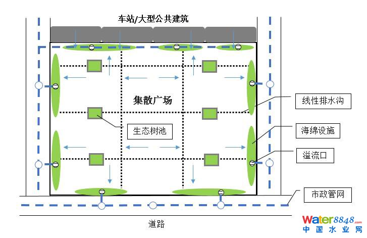 ④市政廣場的海綿設(shè)施均設(shè)置溢流管,超過設(shè)計(jì)標(biāo)準(zhǔn)的雨水溢流入市政管網(wǎng)。