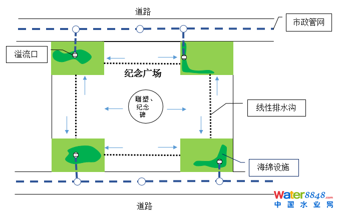 ④紀(jì)念廣場的海綿設(shè)施均設(shè)置溢流管,超過設(shè)計(jì)標(biāo)準(zhǔn)的雨水溢流入市政管網(wǎng)。