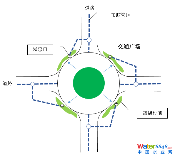 ②交通廣場一般不涉及人的公共活動(dòng),宜設(shè)計(jì)為下沉式,采用小型濕地、濕塘等具有調(diào)蓄功能的海綿設(shè)施,收集與凈化路面雨水徑流。