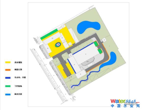 其中,高效率地利用雨水,減少水資源消耗是凸顯“海綿化”改造的重要手段,也是生態(tài)原則的重要體現(xiàn)。通過雨水利用,解決大部分的景觀用水,甚至能夠完全自給自足,實現(xiàn)對城市潔凈水資源的零消耗。在設(shè)計中,回收的雨水不僅用于水景的營造、綠地的灌溉、還用作周邊建筑的內(nèi)部清潔。