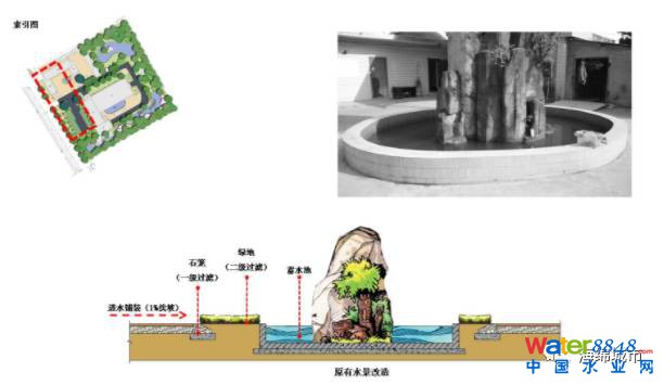 • 辦公區(qū)緊鄰泵站主入口,主要功能為辦公人流集散。根據(jù)現(xiàn)有功能對活動區(qū)內(nèi)的鋪裝進行改造,改為透水混凝土或透水磚。場地中央的水景保留,在外圍增加生物滯留帶,凈化入池的雨水。