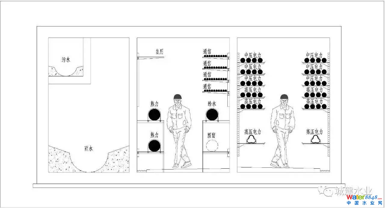 下圖為幾種雨污水管道在管廊中的布置形式。