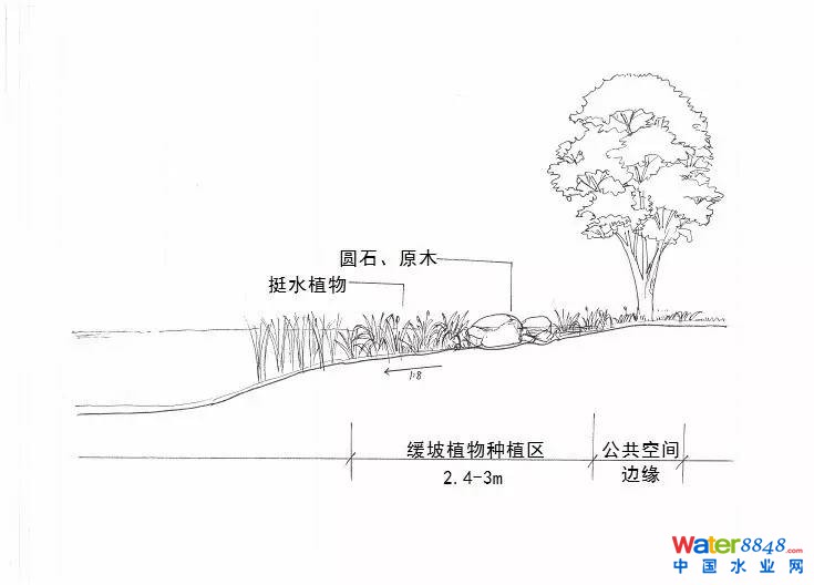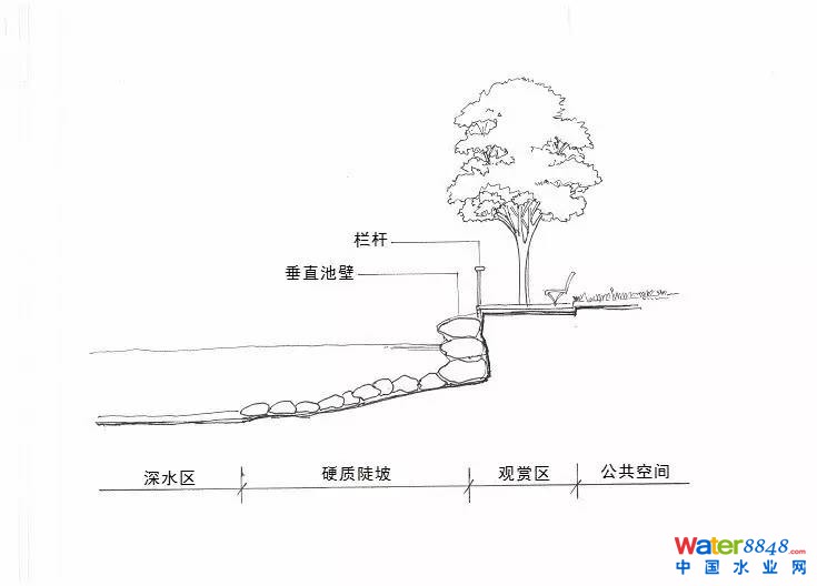 緩坡設(shè)計(jì)邊坡坡度小,一般取1:8-1:10,長(zhǎng)度一般取2.4-3m。坡上可以放置圓石及原木、種植挺水植物以營(yíng)造自然景觀。緩坡設(shè)計(jì)安全性高、觀賞性好,但占地面積稍大;陡坡設(shè)計(jì)中沉淀池池壁垂直,通過欄桿與外界隔開。陡坡占地面積小,景觀效果稍差。