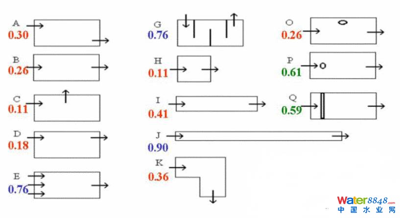 湍流系數(shù)與沉淀池水力效率λ有關(guān),n=1/(1-λ)。水力效率與沉淀池的長(zhǎng)寬比、出入口位置等有關(guān),增大水力效率的途徑包括提高長(zhǎng)寬比、多點(diǎn)進(jìn)水等。沉淀池水力效率應(yīng)不小于0.5,為此沉淀池長(zhǎng)寬比應(yīng)不小于3:1。圖3-4是常見沉淀池結(jié)構(gòu)下水力效率λ取值: