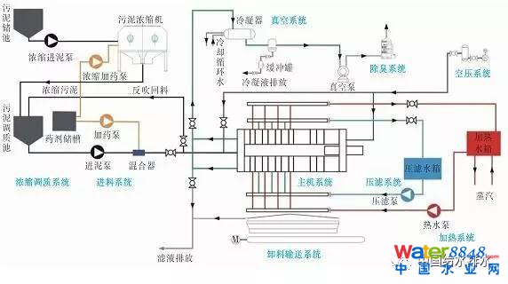 每套低溫真空脫水干化系統(tǒng)主要包括污泥調(diào)質(zhì)系統(tǒng)、主機(jī)系統(tǒng)、進(jìn)料系統(tǒng)、壓濾系統(tǒng)、加熱系統(tǒng)、真空系統(tǒng)、空壓系統(tǒng)、卸料輸送系統(tǒng)、除臭系統(tǒng)等9個子系統(tǒng)。