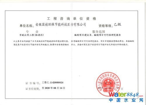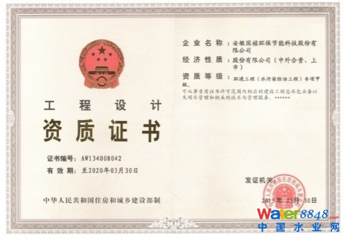 核心提示:國禎環(huán)保設(shè)計(jì)研究院經(jīng)營業(yè)務(wù)范圍主要有:市政污水處理廠及配套管網(wǎng)工程咨詢和設(shè)計(jì)、工業(yè)廢水處理工程咨詢和設(shè)計(jì)、污水處理回用工程咨詢和設(shè)計(jì)、污泥處理工程咨詢和設(shè)計(jì)、河道及湖泊治理工程咨詢和設(shè)計(jì)、土壤及地下水污染評估及修復(fù)、污水處理廠各專業(yè)設(shè)計(jì)優(yōu)化等,現(xiàn)持有國家住建部環(huán)境工程(水污染防治工程)專項(xiàng)設(shè)計(jì)甲級證書、國家發(fā)改委市政公用工程(給排水)工程咨詢乙級證書。