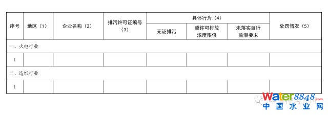 填表說明:(1)具體到企業(yè)所在縣(區(qū));(2)企業(yè)注冊名稱全稱;(3)無證排污企業(yè)填無;(4)勾選對應(yīng)的行為,可多選,無相應(yīng)行為的可不選;(5)簡要說明具體行為和采取的處罰情況。