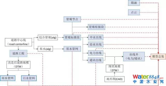 市政綜合項(xiàng)目尤其改造項(xiàng)目涉及專(zhuān)業(yè)廣泛,包括道橋水暖涵,雨污訊電燃等,各專(zhuān)業(yè)相互獨(dú)立同時(shí)又需要密切配合。施工圖的繪制,未采用協(xié)同平臺(tái)的情況下,各專(zhuān)業(yè)除了內(nèi)部校審還需要相互會(huì)簽以保證圖紙及設(shè)計(jì)的嚴(yán)謹(jǐn)性,各專(zhuān)業(yè)將自身設(shè)計(jì)交付到管線綜合人員,管綜結(jié)果反饋給各設(shè)計(jì)師,各專(zhuān)業(yè)根據(jù)管綜調(diào)整設(shè)計(jì)并進(jìn)行“返圖”(將其他專(zhuān)業(yè)管線反饋到本圖紙)。而不論是否采用協(xié)同平臺(tái),由于二維圖紙中常采用標(biāo)高表述管線之間或管線與構(gòu)筑物之間相互關(guān)系,不能體現(xiàn)管道壁厚,無(wú)法直接準(zhǔn)確度量相互之間凈距,導(dǎo)致管綜成為進(jìn)度控制因素,而設(shè)計(jì)變更時(shí)管線綜合顯得更為重要。管綜工程師存在任務(wù)重、責(zé)任大、風(fēng)險(xiǎn)高的特點(diǎn)。一旦管綜人員不再跟進(jìn)該項(xiàng)目,接手人員需要較長(zhǎng)時(shí)間熟悉項(xiàng)目,處理項(xiàng)目上的問(wèn)題則需要更長(zhǎng)的時(shí)間。亟需能準(zhǔn)確表達(dá)直觀表現(xiàn)、能與設(shè)計(jì)互動(dòng)的工作流程,同時(shí),要體現(xiàn)“設(shè)計(jì)的生命周期”。