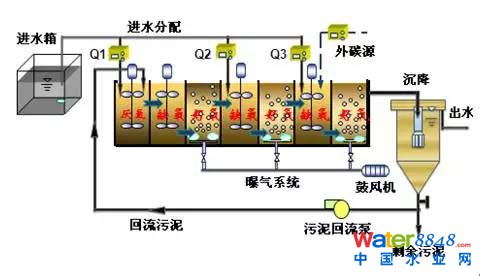 分段進(jìn)水脫氮除磷工藝的工藝方式有:四段式A/O分段進(jìn)水脫氮除磷工藝、A2/O分段進(jìn)水工藝和改良UCT分段進(jìn)水深度脫氮除磷工藝。技術(shù)特點(diǎn)主要體現(xiàn)在以下三個(gè)方面: