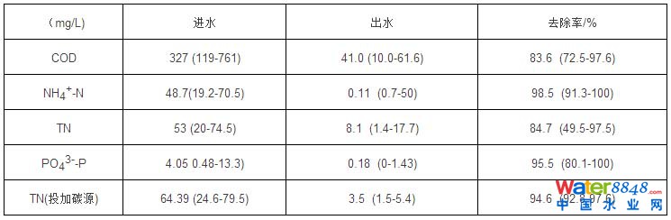 進(jìn)水水質(zhì)見表1,去除率見表2