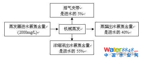 進(jìn)入蒸發(fā)器后的氨氮通過三個途徑排出蒸發(fā)器:蒸餾出水、濃縮液出水、排氣夾帶。由于氨在水中的溶解度極大,所以排氣中夾帶氨量很少,蒸發(fā)之后的氨氮主要存在于濃縮液和蒸發(fā)出水中。因此蒸發(fā)工藝出水氨氮含量高,一般不能達(dá)到排放標(biāo)準(zhǔn)的要求,需增加后續(xù)去除氨氮的設(shè)施。以進(jìn)水氨氮2000mg/L計算為例,其平衡圖見圖1。由于蒸發(fā)之后的氨氮含量仍遠(yuǎn)遠(yuǎn)高于排放標(biāo)準(zhǔn)的要求,因此蒸發(fā)后必須進(jìn)行脫氮處理。目前國內(nèi)常用的方法是采用離子交換法去除氨氮。