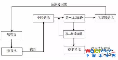 滲濾液直接進(jìn)行膜分離技術(shù)是指滲濾液不進(jìn)行生化處理,經(jīng)過簡單的預(yù)處理后直接進(jìn)入反滲透處理系統(tǒng),反滲透清液出水達(dá)標(biāo)排放,產(chǎn)生的濃縮液回灌填埋場或送城市污水處理廠,其工藝流程見圖2。