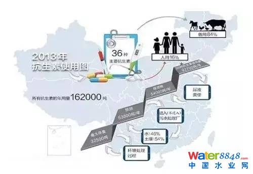 中國(guó)科學(xué)院污染地圖首次詳細(xì)披露了各地抗生素使用和排放量:中國(guó)2013年使用的16.2萬(wàn)噸抗生素中,獸用52%,人用48%。
