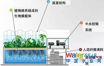 食物鏈反應(yīng)器FCR(Food Chain Reactor)工藝由一系列串聯(lián)布置的生化反應(yīng)器組成,利用生化反應(yīng)器中的固定生物膜和懸浮生物降解進(jìn)水中的污染物質(zhì)。參與生化降解的微生物體主要是附著在自然植物根系和工程化生物填料上,僅有很少一部分為懸浮狀態(tài)。作為該工藝的顯著特征,生化反應(yīng)池被美觀的外部結(jié)構(gòu)(陽光棚)覆蓋,以保護(hù)其中的“植物園”。