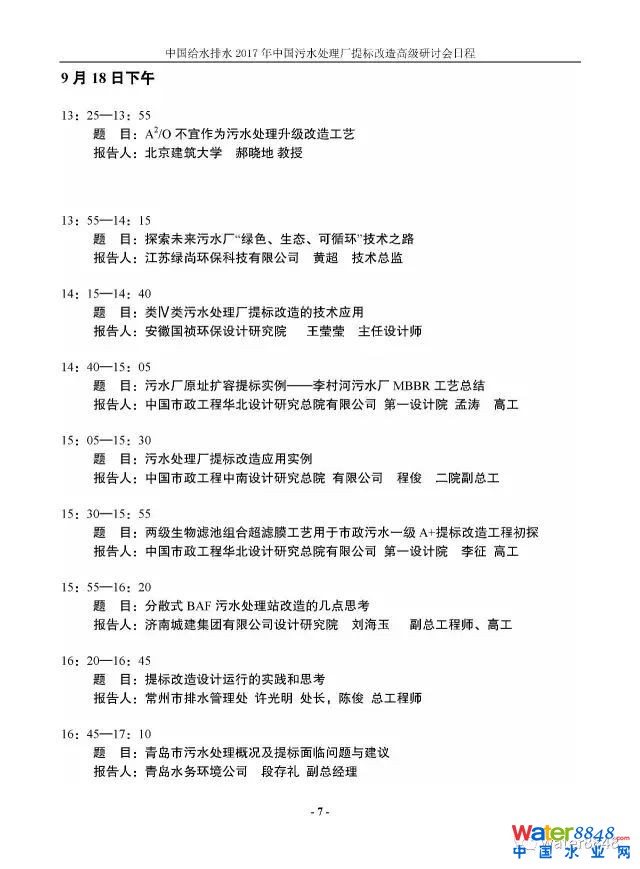465頁內(nèi)文,48位專家報(bào)告:中國給水排水 2017年中國污水處理廠提標(biāo)改造高級(jí)研討會(huì) 論文集目次