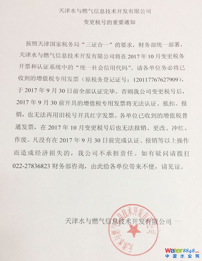 按照天津國(guó)家稅務(wù)局“三證合一”的要求,財(cái)務(wù)部統(tǒng)一部署,天津水與燃?xì)庑畔⒓夹g(shù)開發(fā)有限公司將在2017年10月變更稅務(wù)開票和認(rèn)證系統(tǒng)中的“統(tǒng)一社會(huì)信用代碼”。請(qǐng)各單位務(wù)必將已收到的增值稅專用發(fā)票(原稅務(wù)登記證號(hào):120117767627909),于2017年9月30日前全部認(rèn)證完畢。否則我公司變更稅號(hào)后,2017年9月30前開具的增值稅專用發(fā)票將無法認(rèn)證、抵扣、報(bào)銷,也無法再用舊稅號(hào)開具紅字發(fā)票。各單位已收到的增值稅普通發(fā)票,在2017年10月變更稅號(hào)后也無法報(bào)銷、更改、沖紅、作廢。凡沒有在2017年9月30日前完成認(rèn)證、報(bào)銷等以上操作而造成經(jīng)濟(jì)損失的,我公司不承擔(dān)責(zé)任。如有疑問請(qǐng)撥打022-27836823財(cái)務(wù)部咨詢,由此給各單位帶來不便,請(qǐng)見諒。